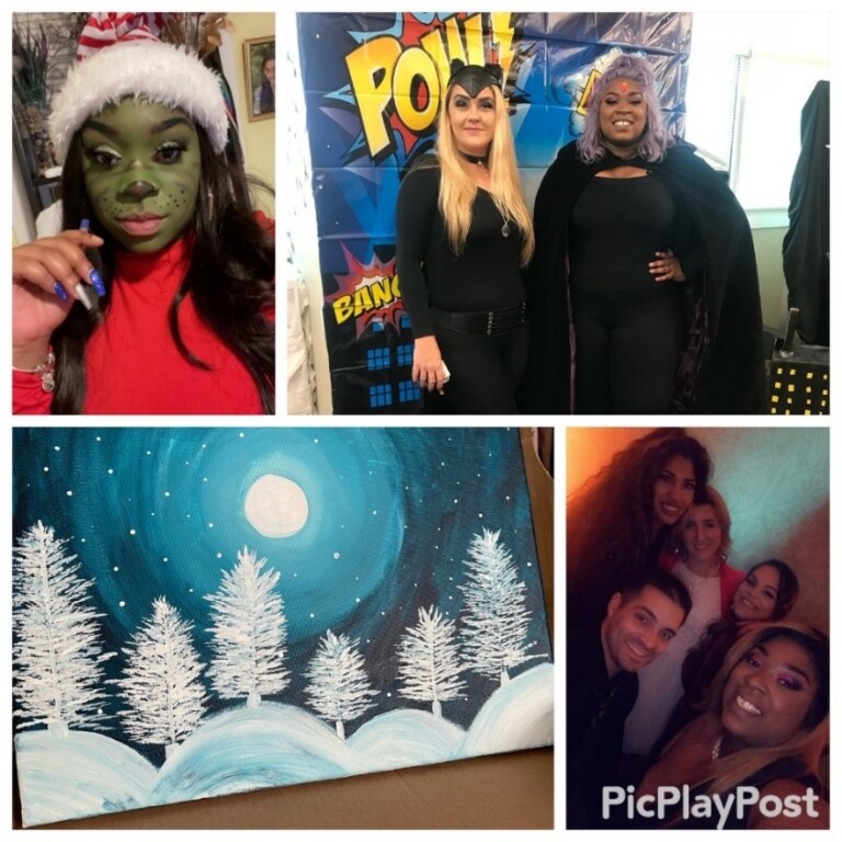 Top (left to right): Danielle participating in a virtual Provider Services Christmas Party and in a Neighborhood Halloween Contest – Provider Services Department (Gotham City) Bottom (left to right): 2021 Virtual Paint and Vino and 2019 Neighborhood Gala