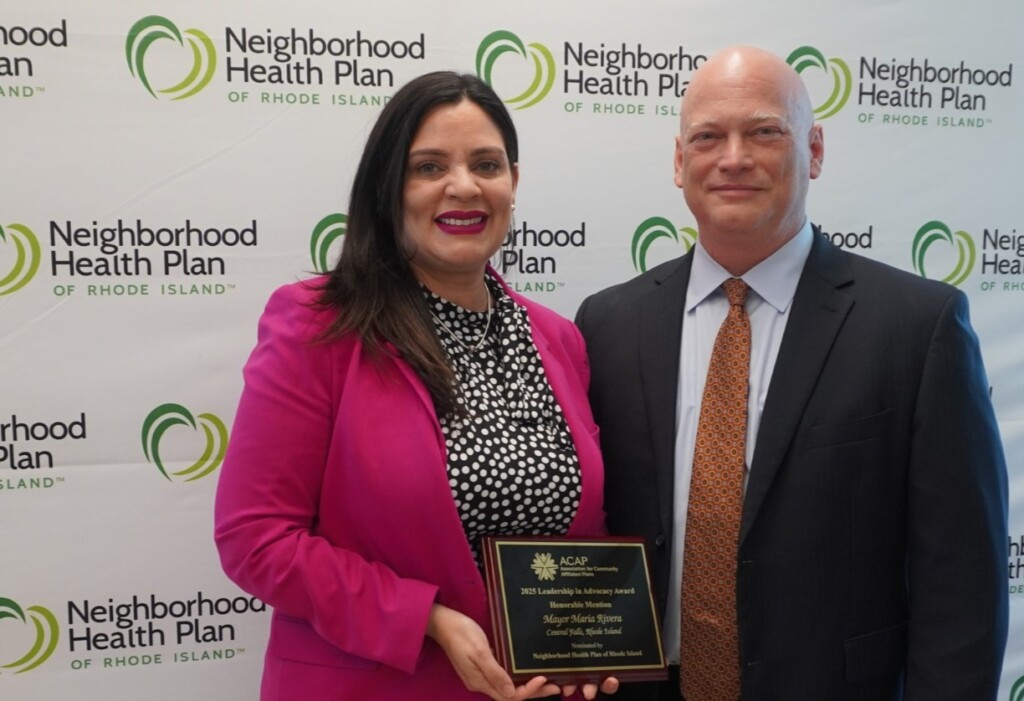 April 30, 2025 (Smithfield, RI) – A special guest joined President & CEO Peter Marino and all Neighborhood Health Plan of Rhode Island employees at its office headquarters for a special award presentation. There, Central Falls Mayor Maria Rivera was honored with a “Leadership in Advocacy” award from the Association of Community Affiliated Plans (ACAP) for her leadership and advocacy efforts to support vulnerable populations.